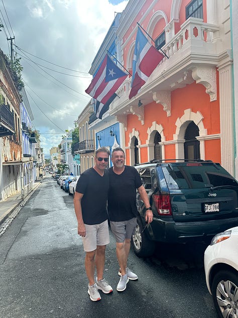 After a long day of travel, and by long, I mean arctic-level cold flights where I briefly wondered if frostbite was included with my ticket, we finally made it to Puerto Rico. Shawn’s brother, Troy, and his wife, Kathy, joined us for this adventure. They checked into their fancy hotel suite, complete with perks and amenities. We, meanwhile, checked into our humble-but-charming Airbnb studio next door. Let’s just say their room came with its own foosball table … ours came with the world’s slowest elevator.